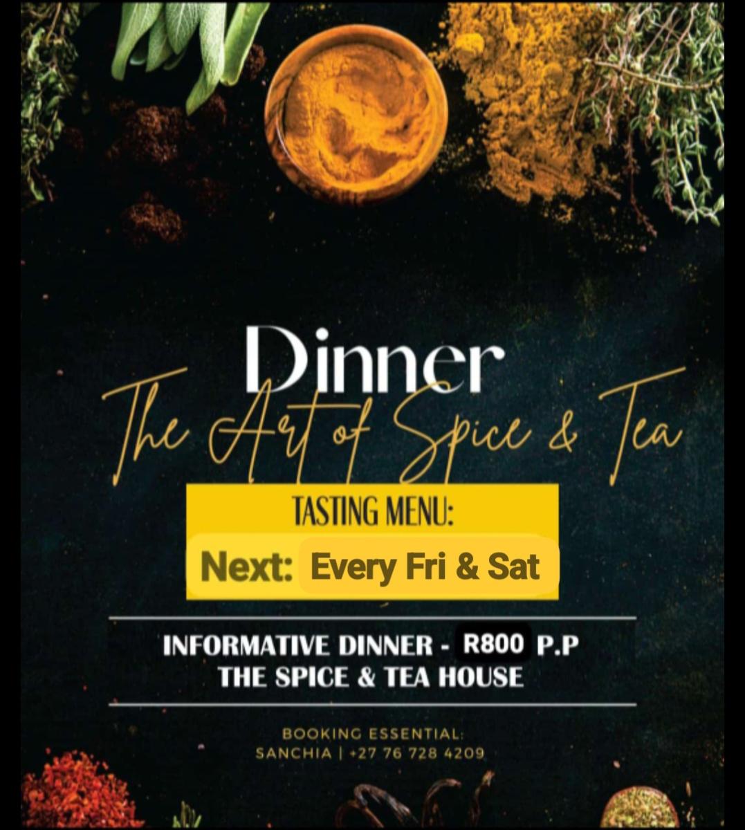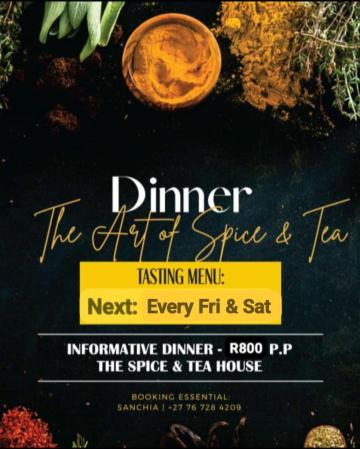 An informative tasting menu exploring spices, botanicals & tea. When: Every Fri & Sat Where: The Spice & Tea House Time:18h30 R800 pp Booking essential: 076 728 4209