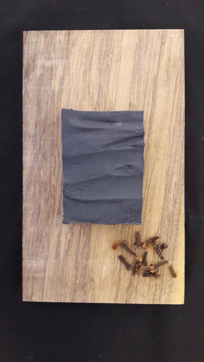 This is a hand-crafted soap made with activated charcoal, clove and coconut oil.