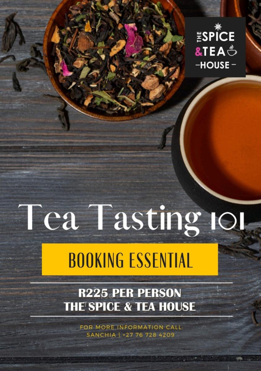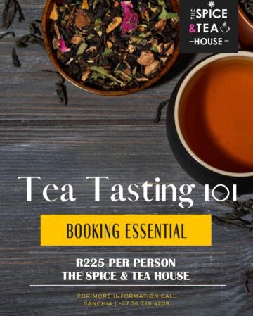 Tea Tasting 101. Join us for an amazing journey into the world of tea! Tues-Sat. 10am or 3pm or by appointment. R225 pp Booking essential as space is limited 076 728 4209.